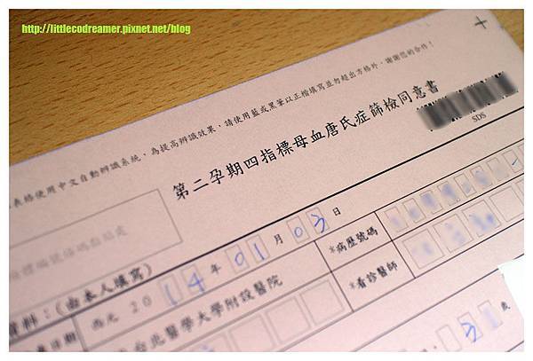 由於錯過了第一孕期唐氏症篩檢 (註3),因此我考慮做四指標篩檢。我戶籍在台北市,北醫的婦產科櫃檯就可以直接辦理補助手續。但必須繳交身分證正反面影本一份。因為沒有事先準備,只好臨時衝到最近的小7影印。手續辦妥、費用繳清後,就開始進行孕期中的第二次抽血。