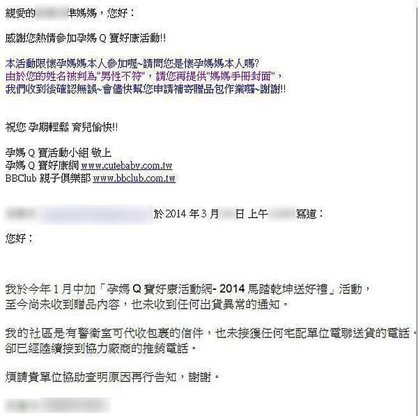 主辦單位真的滿有誠意也很有效率,星期一早上就收到回覆了。只是當我的視線接觸到回信的字裡行間,我的下巴差點沒掉到地上。原來遲遲沒收到包裹是因為:我被當成了男生、我被當成了男生、我被當成了男生……(嗚嗚,名字太中性不是我的錯~~)後來我還是提供了媽媽手冊封面照片來驗明正身,一週內我就收到包裹了。