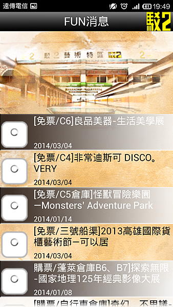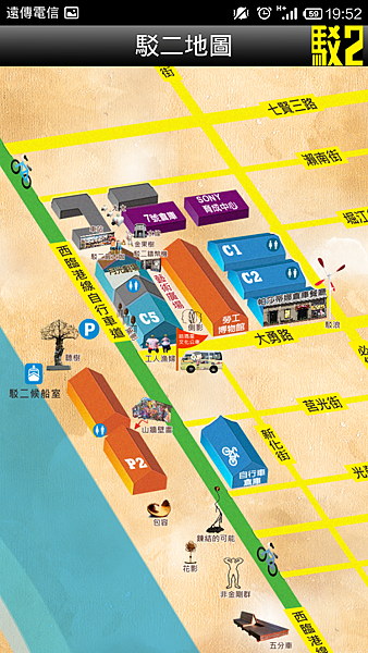 駁二藝術特區其實還有開發導覽APP,包含最新展演消息、園區地圖、交通資訊等,功能雖然單純,但出發前還是可以利用它來掌握駁二的最新動態,有興趣的朋友可以下載看看喔(以下畫面擷取自駁二藝術特區導覽APP)。