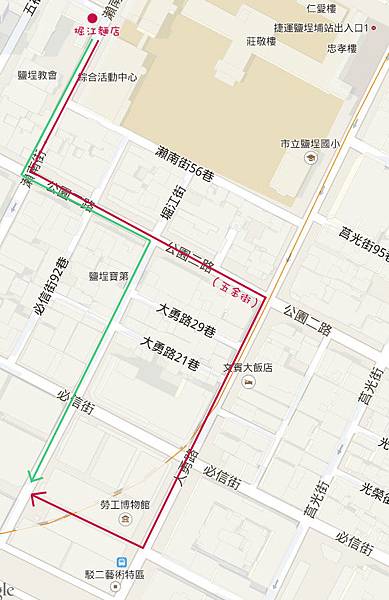 藝術廣場末端銜接堀江街行人徒步區,對於剛剛繞道前往堀江麵店(【旅誌∣高雄‧鹽埕】舊「堀江」、老「麵店」 )飽餐一頓兩人來說,當時並未發現可以從舊堀江商圈直接穿越公園二路進入園區(下圖綠線),所以又不知情多繞路啦(下圖紅線)!