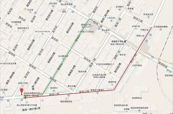 如果要搭捷運過來,建議大家從西子灣站1號出口上來,遇麗雄街左轉後,直行至濱海一路右轉即可抵達(下圖綠線)。我們因為是從西子灣站2號出口出發,所以選擇沿著鼓山一路再接濱海一路的方式(下圖紅線),遇到下班時間,車多不是很好走。