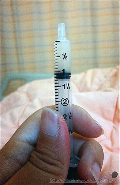 護理師看著小Co媽很肯定地說:「我不相信妳的奶會不夠。」還沒等小Co媽反應過來,就直接幫小Co媽擠出來。說也奇怪,護理師擠奶水就一滴接著一滴冒出來,另一位護理師趕緊拿出針筒接,一下子1ml針管就裝滿了。立刻送入小Co嘴裡,小Co喝得很滿足呢!小Co媽頓時茅塞頓開,好像這才終於領會擠奶的手勁。只是眼淚也痛得從眼角滑落。(@@)