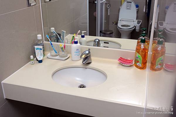 檯面上看到的漱口杯二個、皂盤、沐浴乳和牙膏是月子中心提供的備品。其他的物品像是漱口水(安胎用剩)、牙刷(自己用慣)、洗手乳、洗碗精和菜瓜布(只清潔自己的餐具不想走去配膳間)是自己帶。