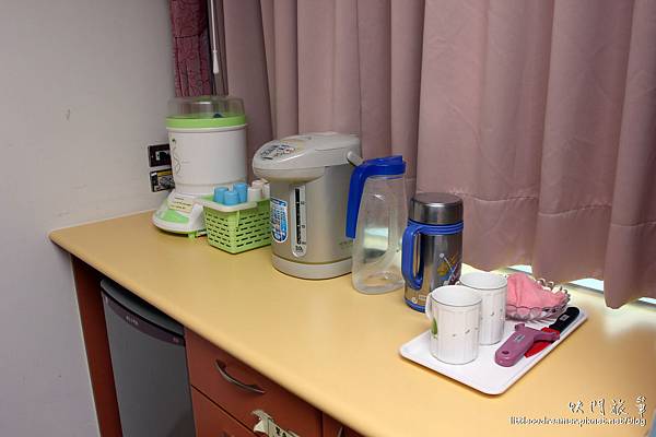 ↑置物平台。有nac nac 蒸氣消毒鍋,消毒奶瓶六支、象印熱水瓶、冷水壺、保溫杯、馬克杯二個、餐盤、水果盤、水果刀、刨皮刀。平台下方有小冰箱,方便冰存母乳和吃不完的食物(配膳室可加熱)。