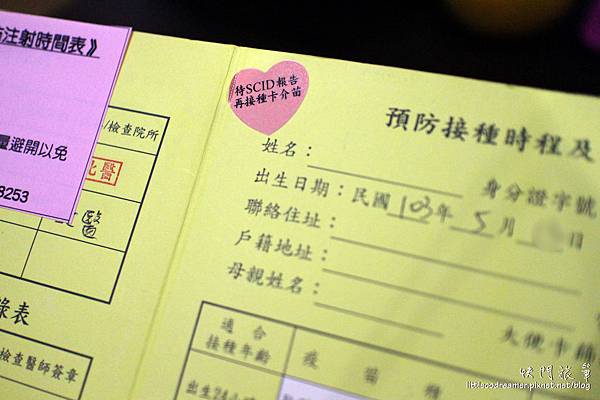 ↑北醫貼心的在《預防接種時程及記錄表》貼上提醒貼紙:待SCID報告再接種卡介苗。